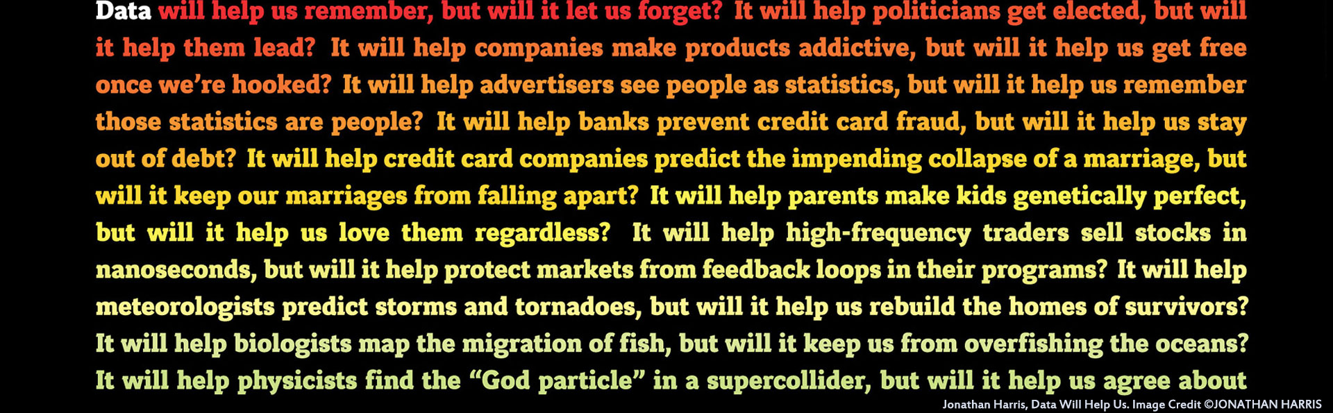 In this chapter, hear from international data experts, artists, and visionaries whose lives are dedicated to retrieving, analysing, and interpreting data, about its limitations.