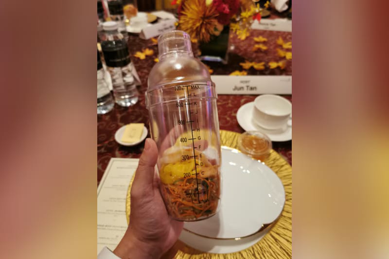 Yusheng, a key highlight during the Lunar New Year, was served in a cocktail shaker this year to ensure that guests adhered to the Safe Management Measures during the luncheon