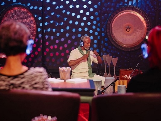 Marina Bay Sands’ Director of Wellness and Recreation Karunanithi demonstrates sound meditation, part of a new wellness programme for business visitors
