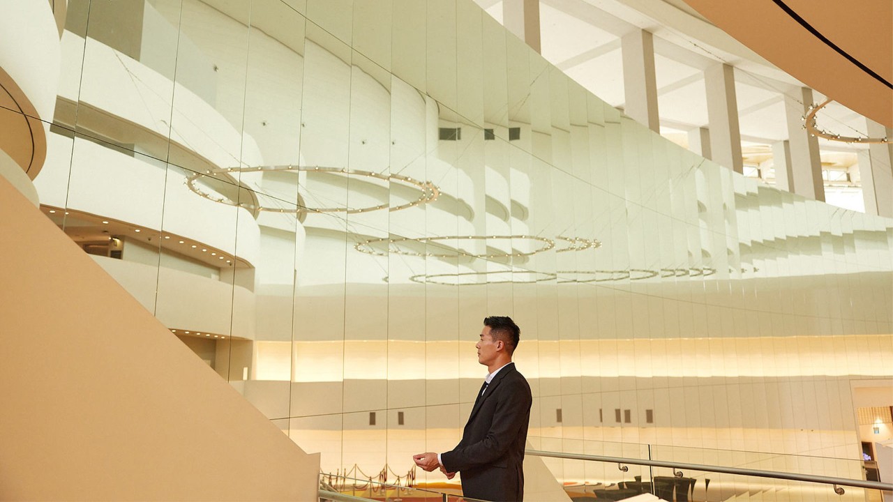 Man in suit at the best theatre in Singapore, the Sands Theatre, to catch a musical performance