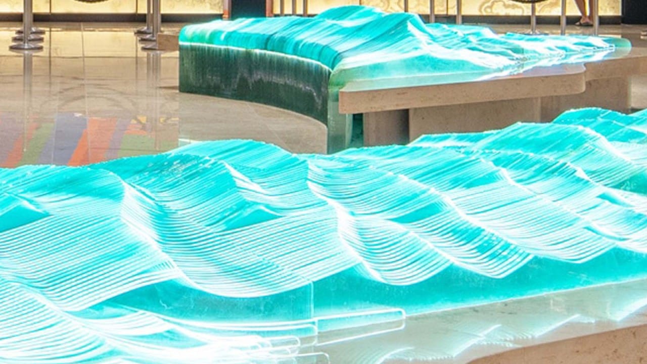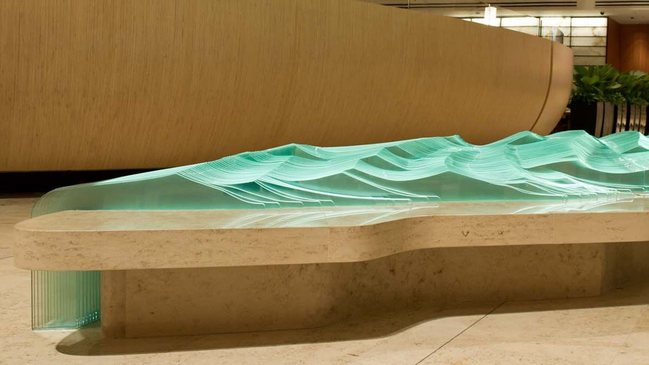 Nestled beneath the captivating Drift is Motion, an art installation that functions both as décor and a functional bench for guests to rest on. The artwork consists of two “islands” made from glass and stone. Light reflects off the glass, mimicking the glistening sparkle of light bouncing off the sea’s waves. The glass components are bordered by a Jura Beige stone bench, complementing the earthy and gilded tones of the Hotel Atrium.