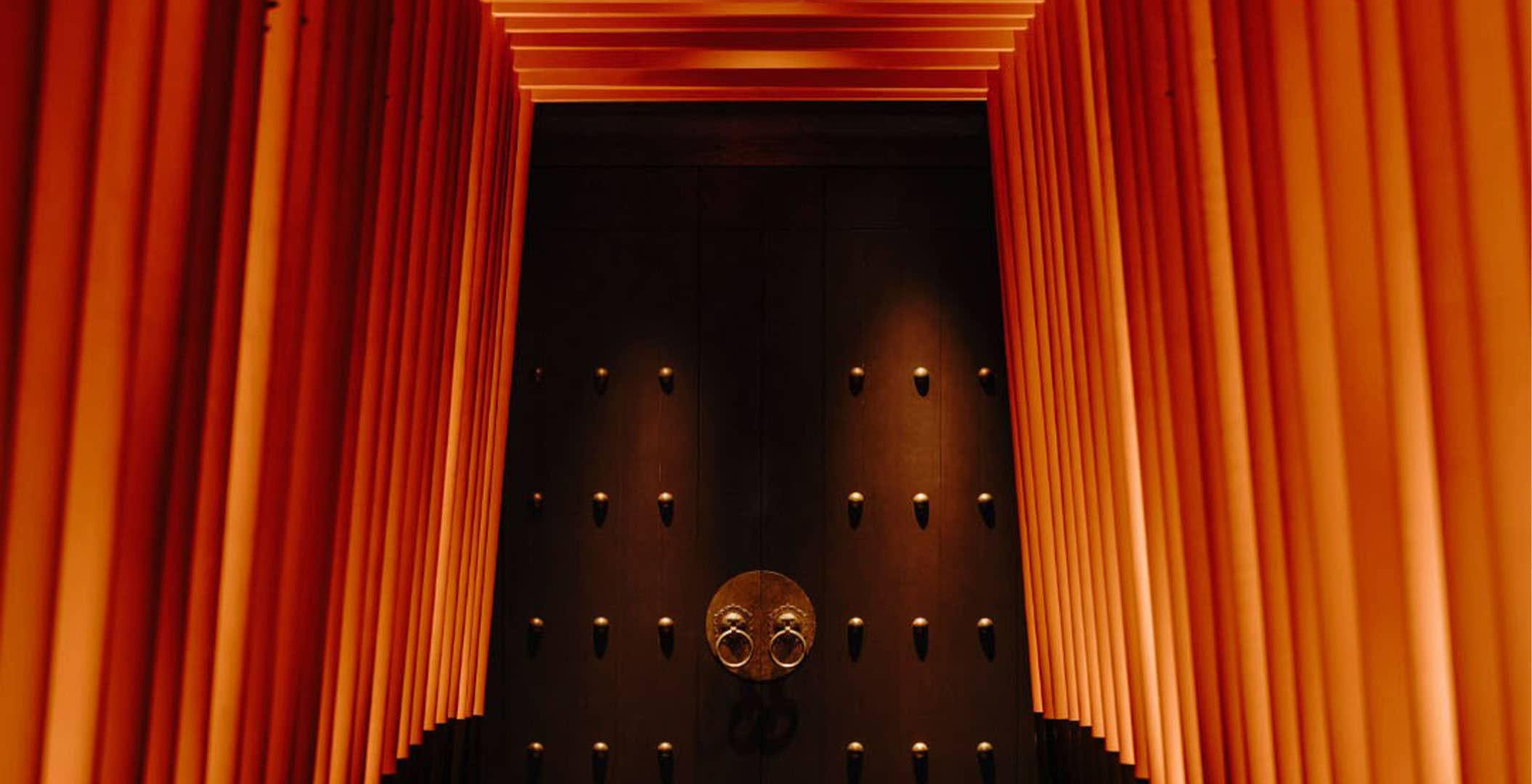 The theatrics at KOMA begin at its impressive entrance. A long passageway is lined with orange cedar sculptural arches, a nod to Kyoto’s famous Fushimi Inari Shrine. The path opens into a stunning dining hall, complete with soaring ceilings, an expansive sushi bar, and a grand ornamental bell suspended above a footbridge.