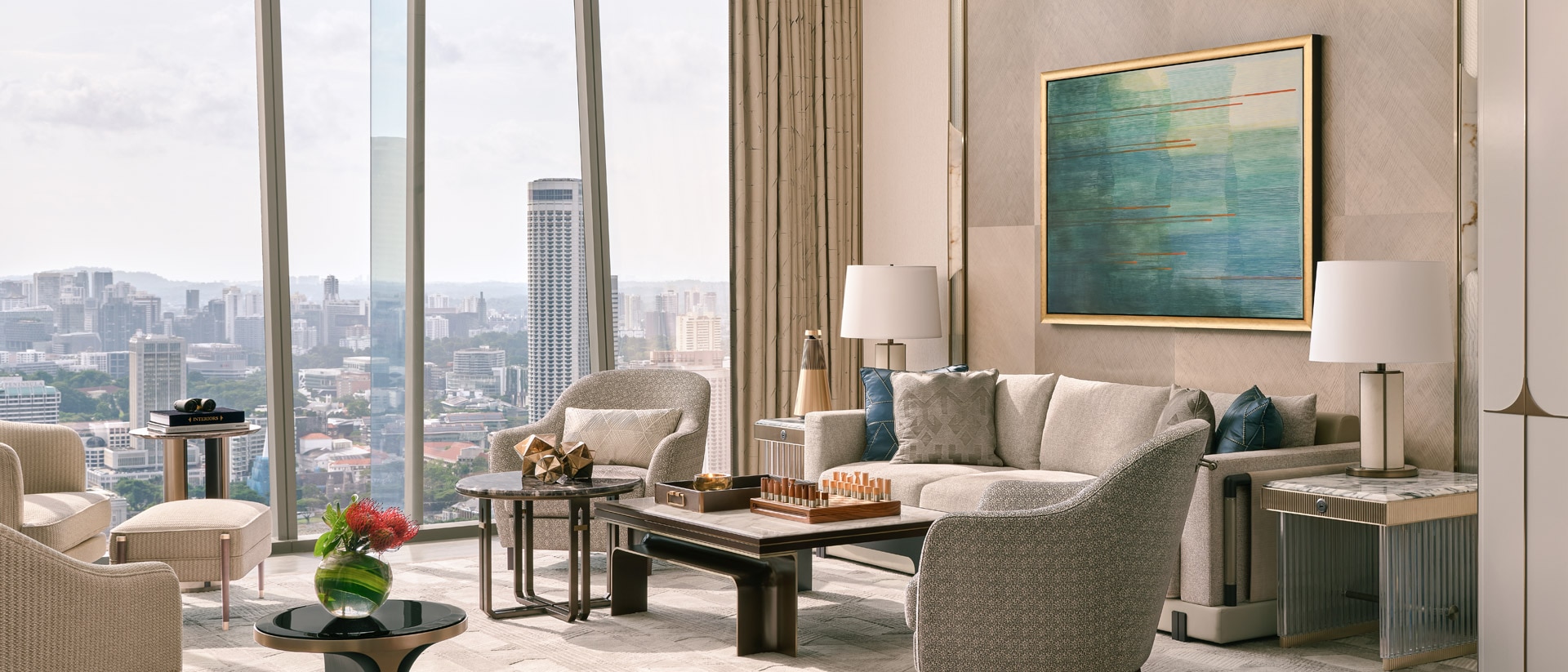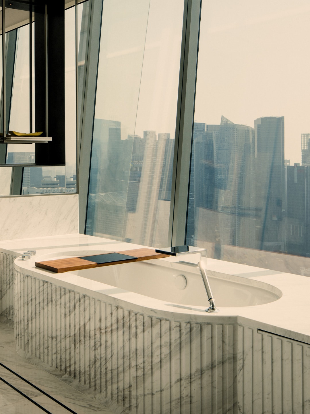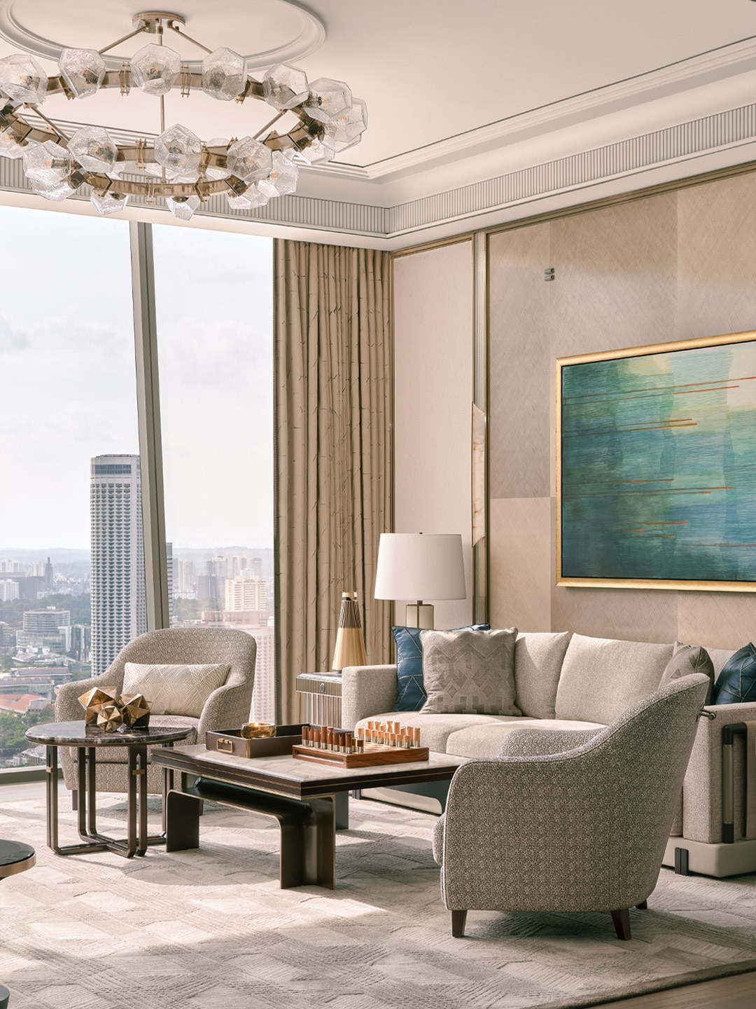 The magnificent foyer, clad in resplendent Italian marble marquetry, sets a refined tone, while original artworks and opulent bespoke furnishings reflect Southeast Asian craftsmanship. Floor-to-ceiling windows showcase superb views of the cityscape and ocean at every turn.