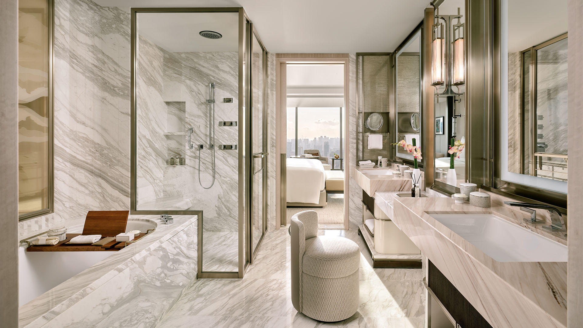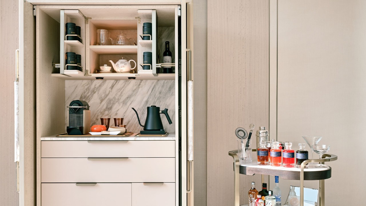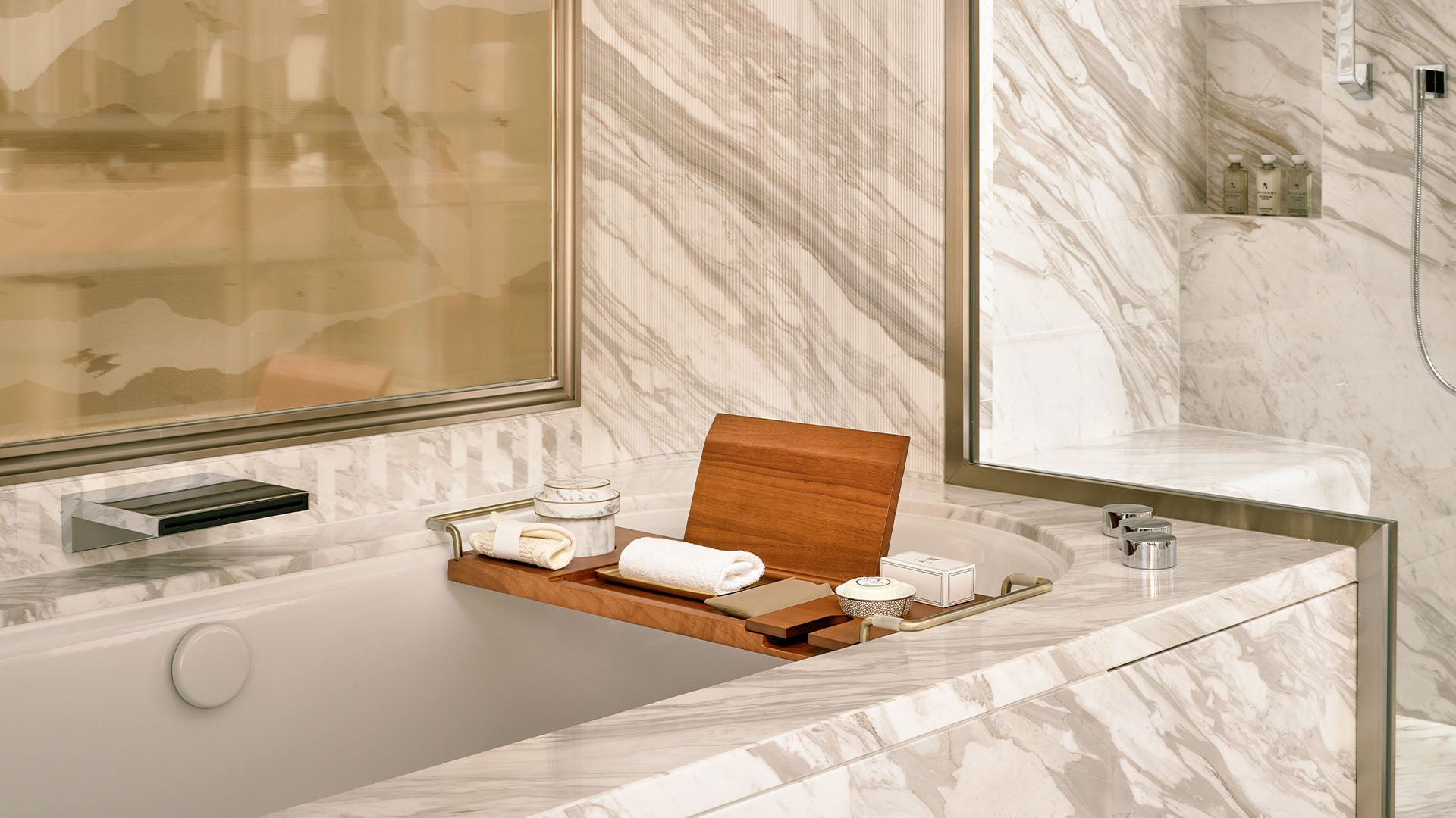 An exquisitely designed and artfully curated haven of calm in the heart of the city. Take a long bath in your expansive bathroom fitted with a concealed TV, and indulge in the generous curation of treasures in the bespoke Armoire.