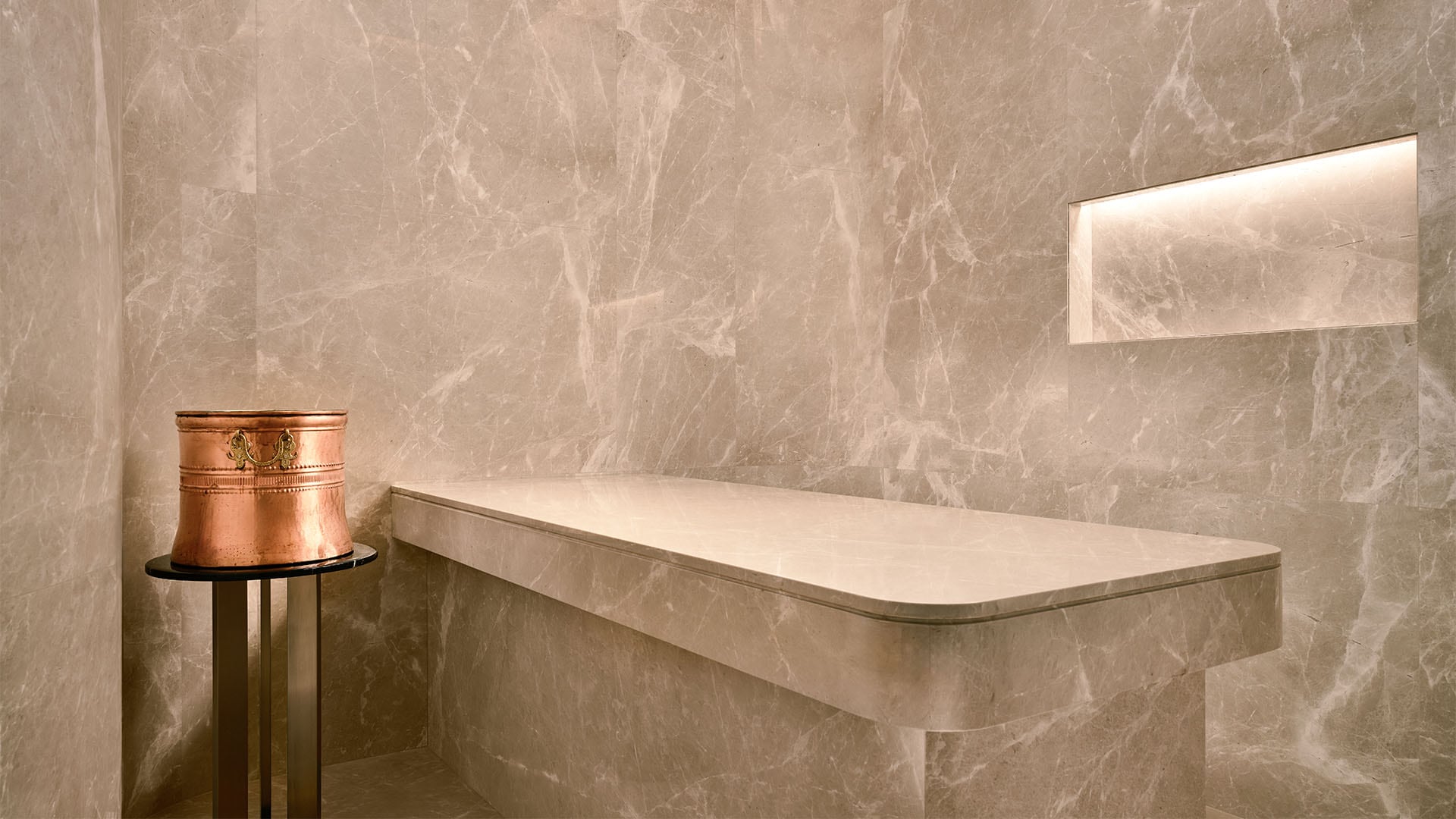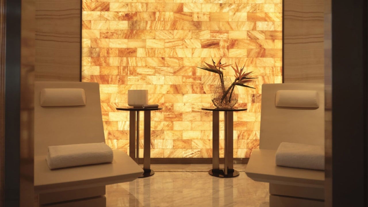 Traditional hammam, Himalayan salt wall and heated ceramic lounge chairs