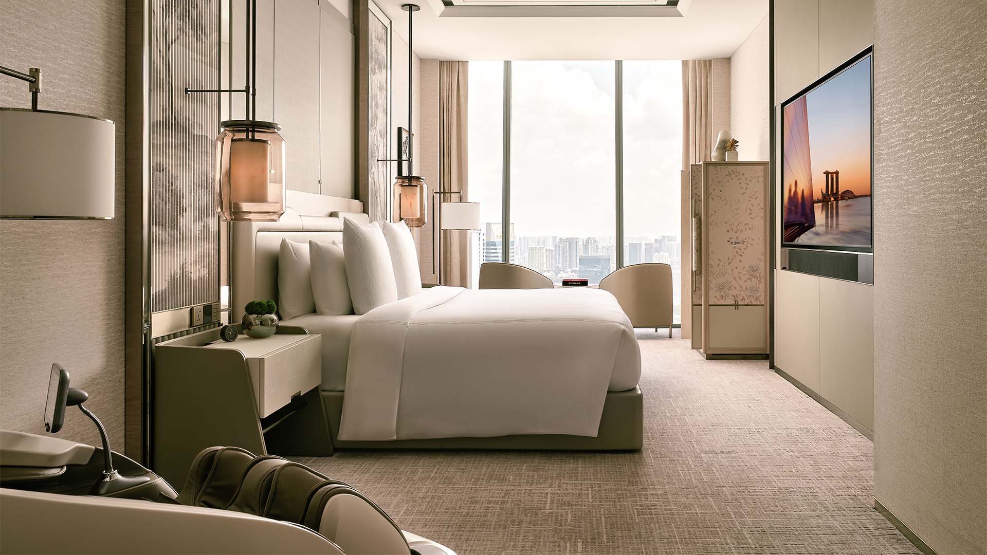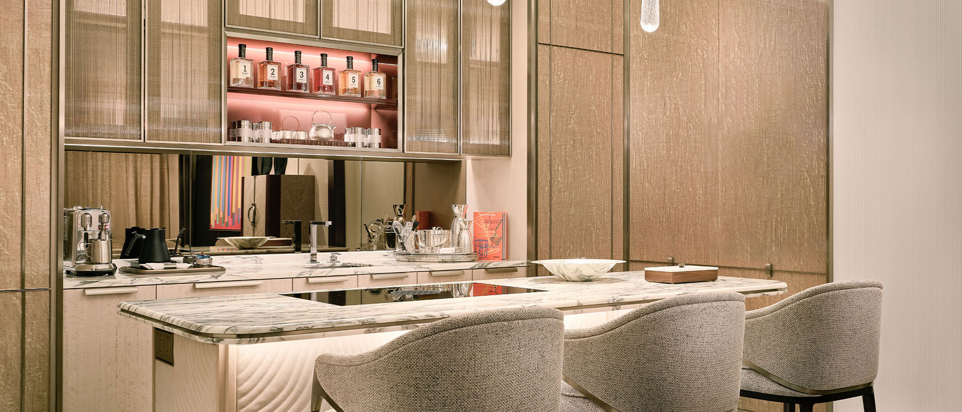 With sweeping views of the sprawling city, the Merlion Suite is a celebration of the island city we call home. Adorned with unique commissioned artworks, the generously sized 2-bedroom suite comes with a fully equipped Social Kitchen, where our chefs can prepare exquisite feasts for you and your guests. Over at the spacious karaoke room, evenings of endless entertainment await.