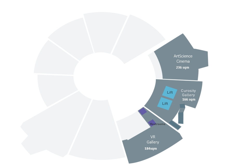 Level 4 | ArtScience Cinema: 66 theatre style seating Lift Lobby: 50 standing VR Gallery: 15 pods style seating | ArtScience Cinema: 236m² Lift Lobby: 166m² VR Gallery: 184m² | Whole Day: S$22,000+ |
