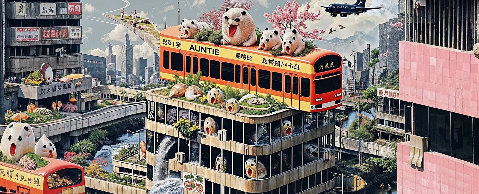 Glimpsing into speculative futures where the architectural and the absurd intersect, Niceaunties fuses 2 of 168 artworks in the Along The River In Auntieverse series - 瀑楼车顶行 (#51) and 车陷峡谷间 (#70) – in considering equality and ecological balance. Maintaining the isometric composition and architectural precision of Zhang Zeduan’s original scroll, the series updates the traditional landscapes through a modern, Auntieverse lens - presenting a future where aunties shape, disrupt, and adapt to speculative worlds. While Zhang’s work captures meticulously detailed urban life, Along the River in Auntieverse expands the narrative beyond human occupation, into landscapes shaped by modern industry and environmental collapse.