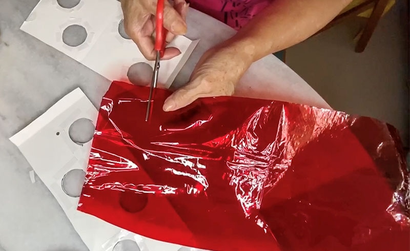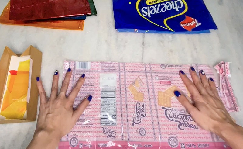 Cut out different patterns and shapes on the paper bag. Layer them with either the food packaging or cellophane.