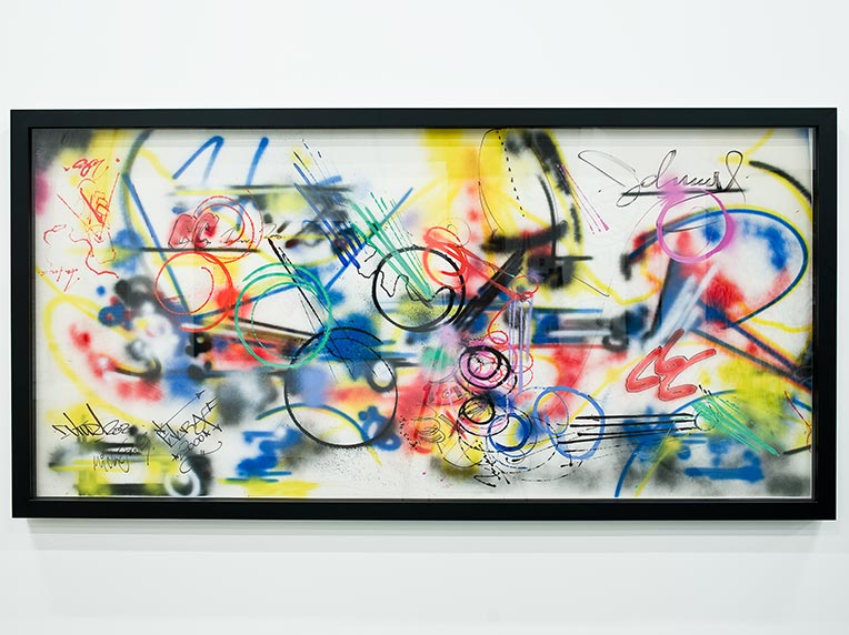 Futura began painting in the New York subway in the 1970s and soon developed his own abstract graffiti style that he called Futuristic. From the outset he chose not to follow the lettering trend, but rather worked to produce visualisations of movement and speed. He excelled in his handling of the aerosol can. He created atmospheres – ethereal worlds full of evanescent symbols – he blended colour explosions and pure lines.
