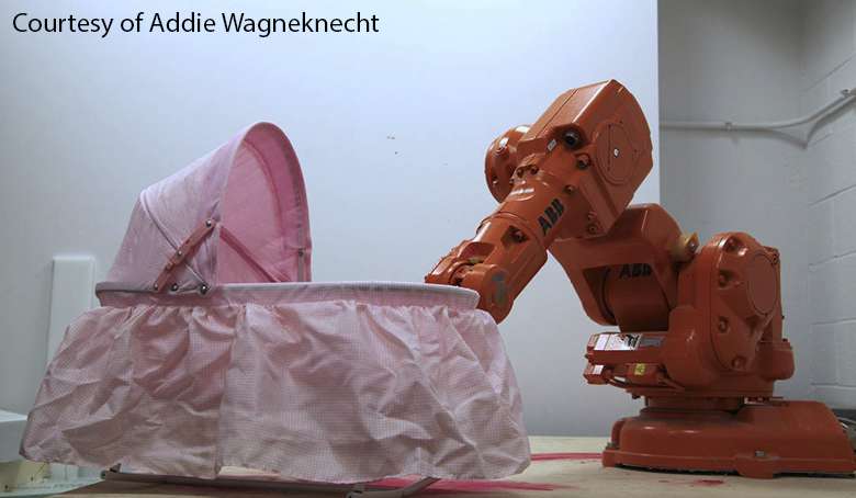 Optimization of Parenting, Part 2 is a robot arm that gently rocks a bassinet whenever the baby inside cries or awakes from sleep. As an artist and a mother, Addie Wagenknecht developed this artwork imagining ways to balance her creative practice with motherhood. Mothers are socially expected to be full-time parents. This is sometimes due to a lack of options, the cost of childcare or a lack of family support. As a result, female artists who become mothers often lose the creative practice they have spent an entire life building.