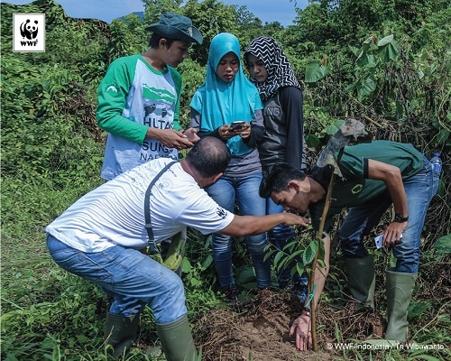 The process of tree planting is a laborious and sometimes treacherous task. To get to the planting site, WWF staff, local communities and volunteers travel 22km from the nursery through dirt roads and major rivers to transport seedlings, clear land, plant trees, and document the growth of each tree.