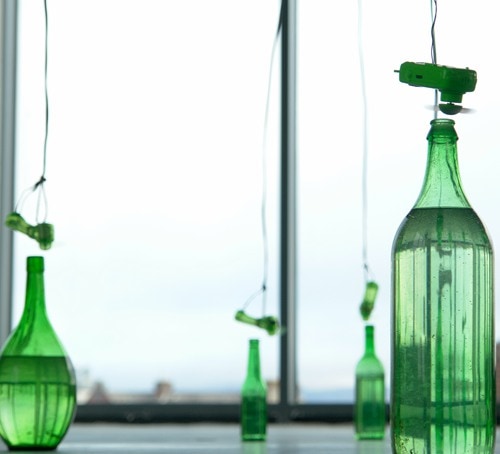 Bottles and Fans is a sound installation consisting of glass bottles and travelling fans. The fans are placed on top of bottles filled with water, which create a rich sound experience. The water evaporation resulting from the fan’s cooling force orchestrates a melody which changes over time.