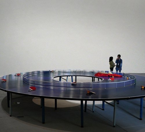 Much of Lee Wen’s work has been motivated by a desire to use art to interrogate stereotypical perceptions. Ping Pong Go-Round reinvents the structure and rules of Ping Pong to show alternative models of interaction between the players. Unlike the traditional table, Lee Wen’s Ping Pong table has no borders, allowing multiple possibilities for a broader dialogue between players involved.