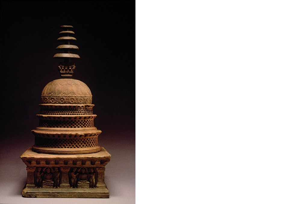 This is a model of a stupa, a monument built to consecrate relics of the Buddha or distinguished monks. Ashoka the Great (r. 268 –232 BC), who unified most of the Indian sub-continent for the first time, is said to have re-distributed the Buddha’s relics into 84,000 stupas across his empire. The spire on top, imagined to run directly through the dome into the ground, symbolises the axis-mundi – the central pillar of the cosmos connecting Heaven and Earth.