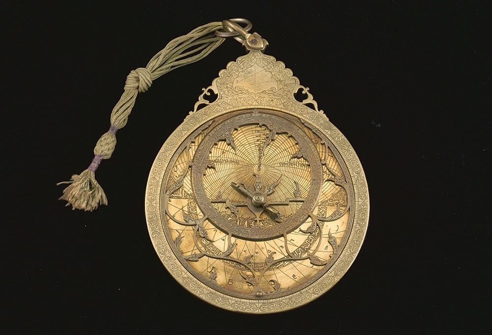 Invented by the Greeks around 220 BCE, astrolabes represent in two dimensions the rotations of three-dimensional celestial spheres. Muslim scientists from the 9th century developed new features which can be observed on this example — shadow squares for solving trigonometry problems, a universal plate with markings for both equatorial and ecliptic coordinate systems, and the movable straight edge called an alidade used to measure the altitude of celestial objects, and so on.