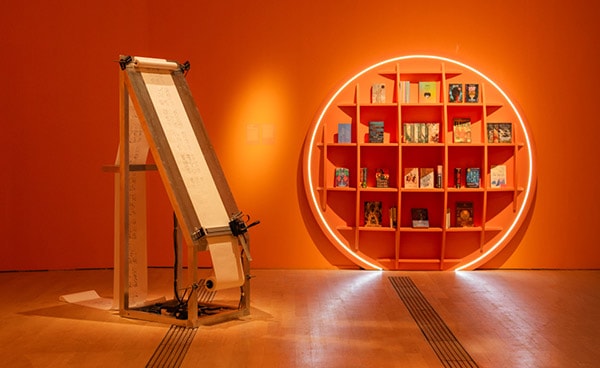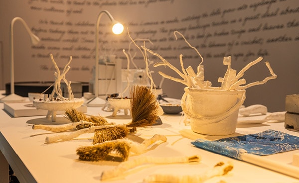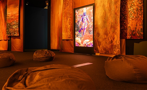 The opening space of the exhibition evokes a forest both familiar and strange, drawing inspiration from Singapore’s vision of a “city in a garden” while incorporating the textures and traditions of Southeast Asia. This environment, suspended between past and future, sets the stage for works that explore memory, heritage, and imagination. Syafiq Halid’s The Space Remembers You invites visitors into a sonic landscape shaped by traditional Malay sounds, reconfigured into an immersive 14-channel installation that listens and responds like a living organism. Alongside it, Torlarp Larpjaroensook’s Spiritual Spaceships transforms everyday objects into spaceship-like sculptures, suggesting that even the most ordinary items can become vessels of futurity.