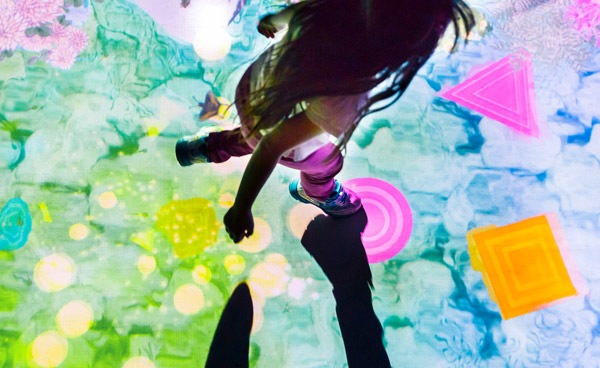 Design your own customised hopscotch game in this unique installation. Arrange circles, triangles and squares on an electronic tablet, and the arrangement will be projected onto the floor.