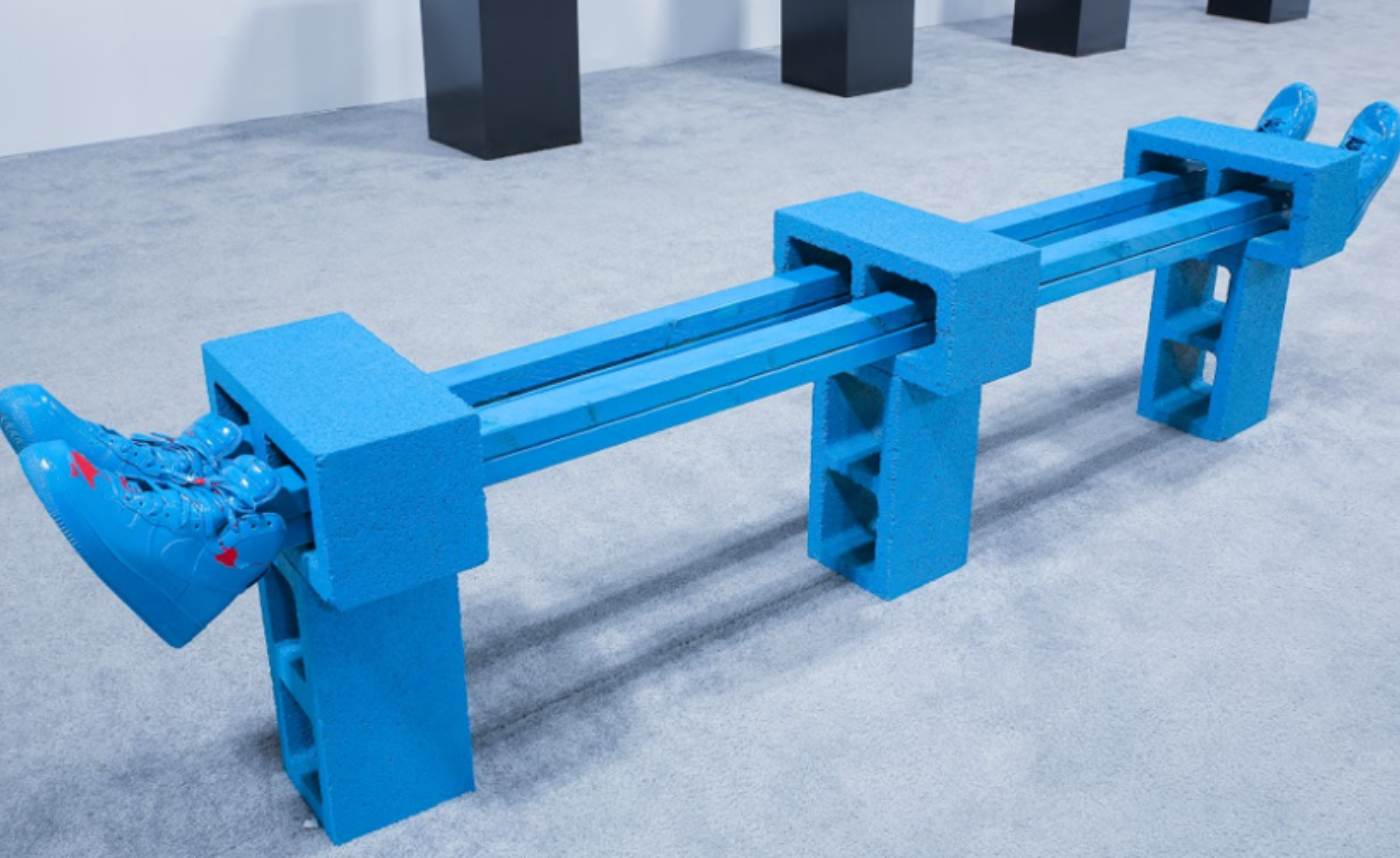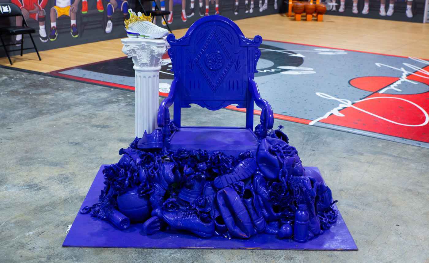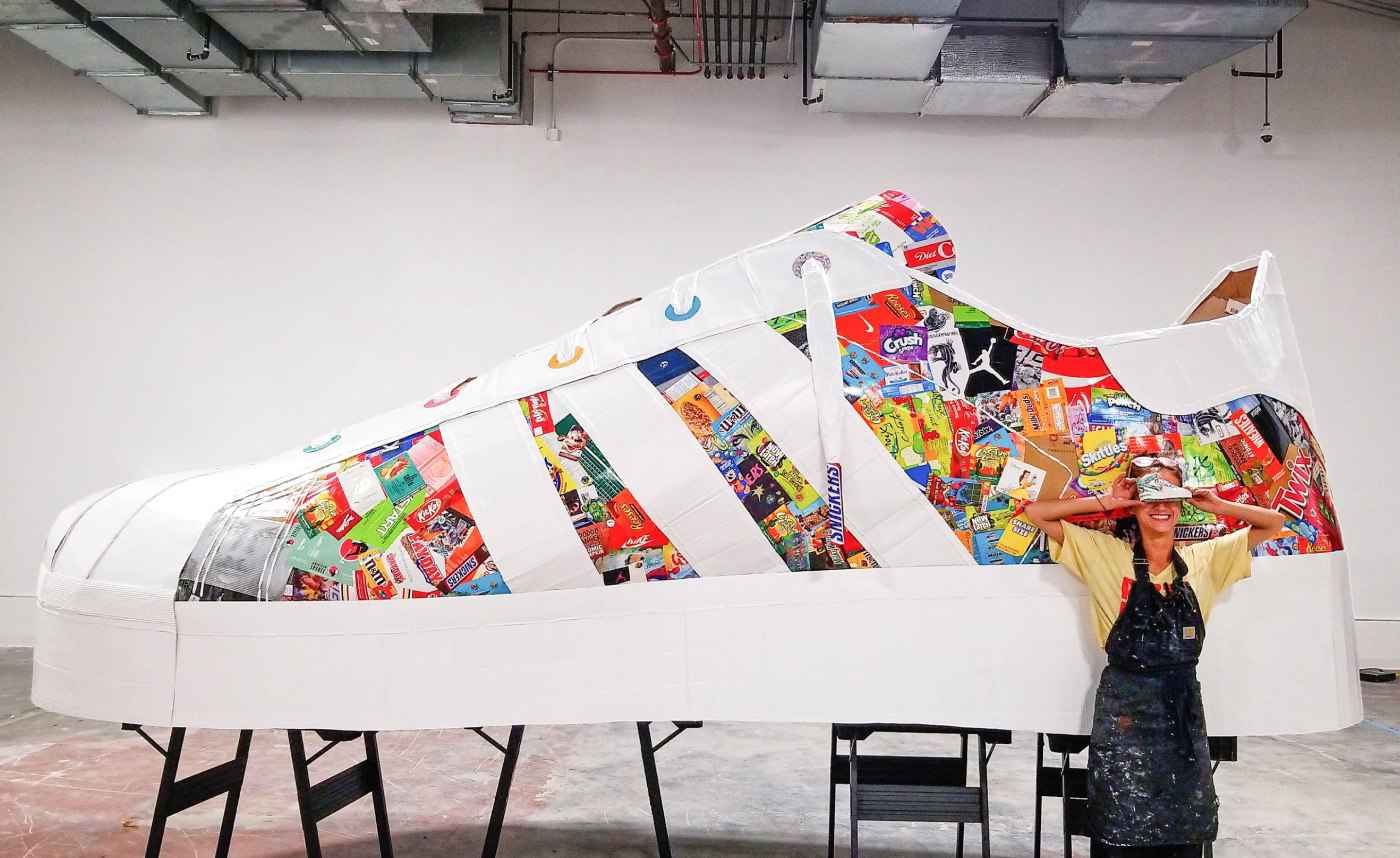 Spread across two zones, the first part of Art + Sole focuses on sustainability—with creatives Smoluk, Aeropalmics and Josiah Chua repurposing and upcycling elements like cardboard, fabrics and sneaker parts to generate new works. These works prompt reflection on contemporary society, patterns of mass consumption and hype culture.
