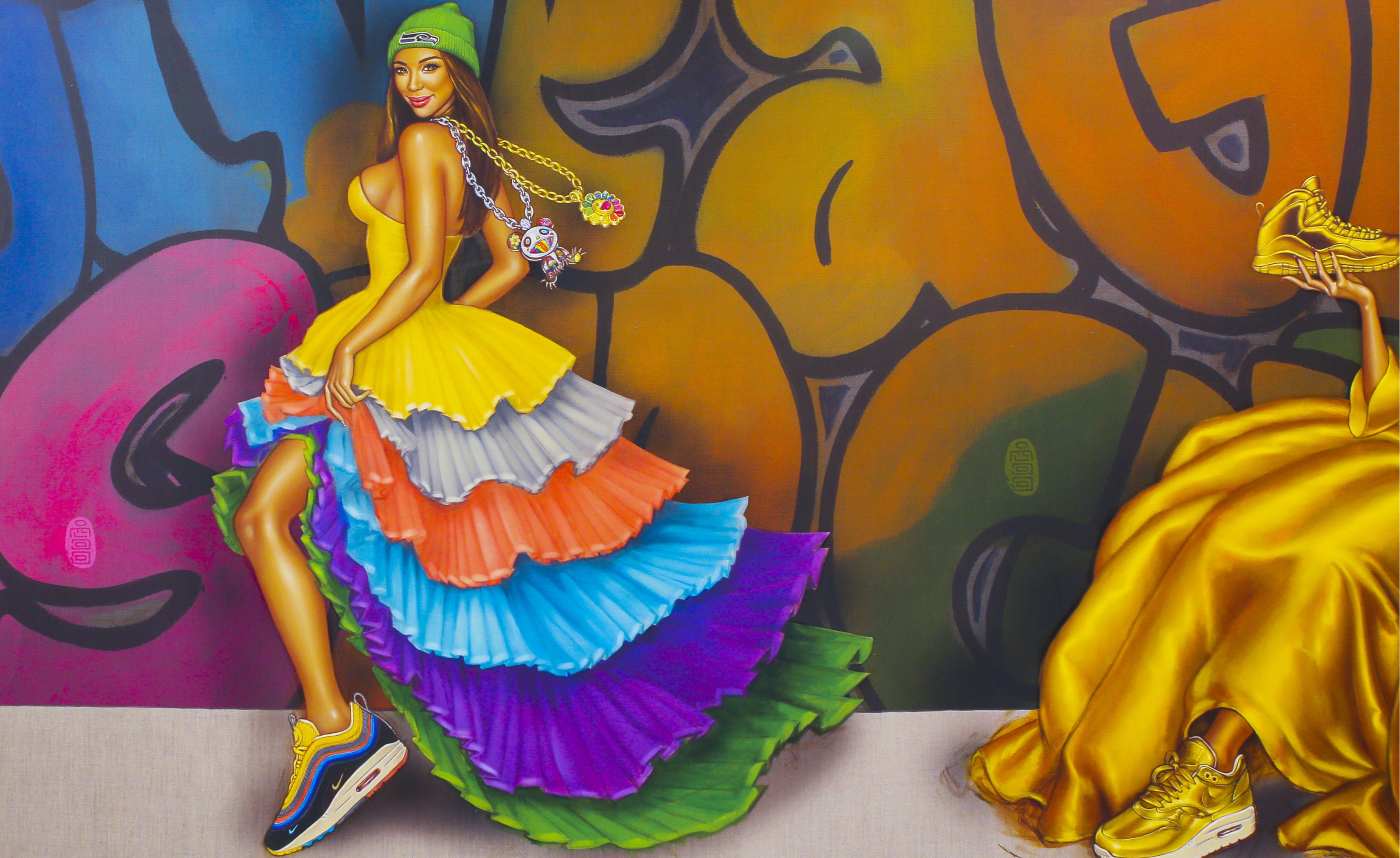The second Art + Sole zone merges sneaker culture with street art, offering progressive takes on graffiti carried forward by a new generation of artists. Mimi Yoon makes a social statement, embracing femininity and the strength of women; whilst Juls engages in mark-making and automatic drawing, taking references from tags and graffiti writing.Selected artworks