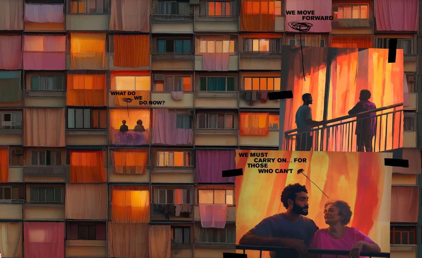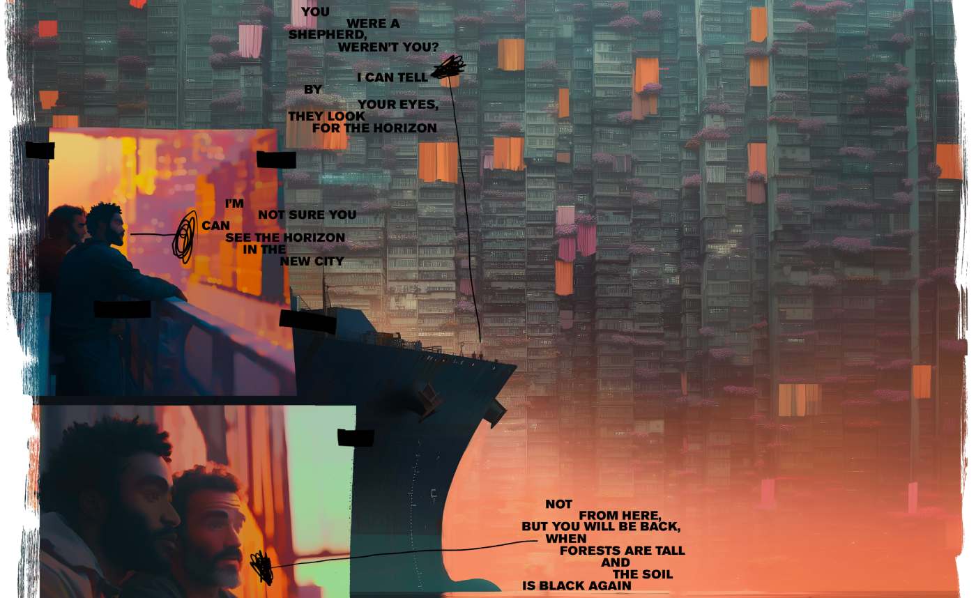As the comic pages unfurl, we are introduced to a former shepherd who is fleeing his dying family farm, ravaged by climate collapse. His long journey begins in the dismantled ruins of the old world, before he arrives at the shores of Planet City. Here, food grows in towering, automated vertical farms bathed in artificial light; glowing algae canals and wildflower blooms snake between the buildings.