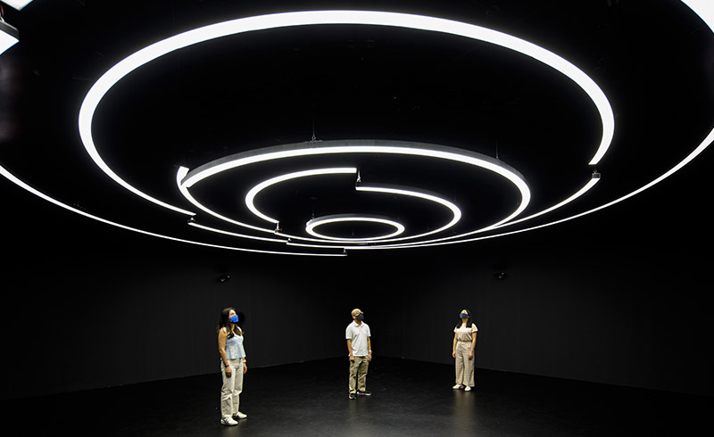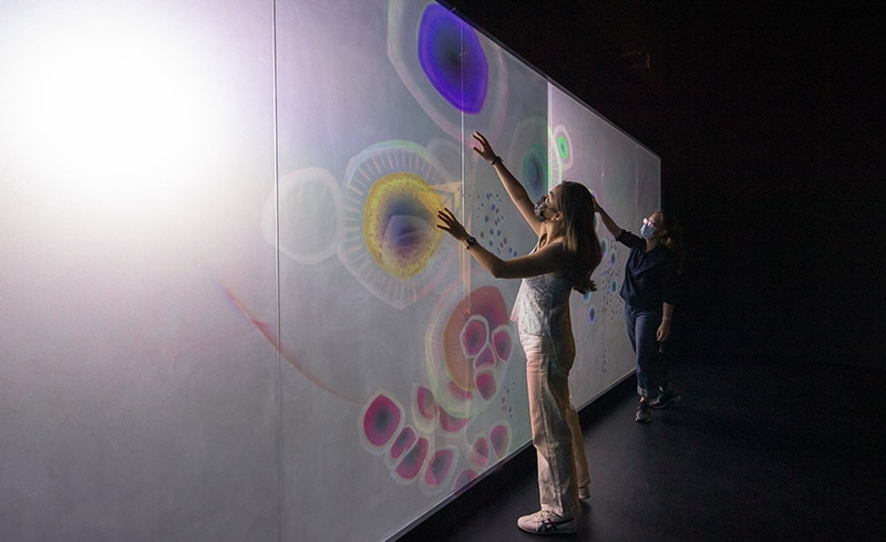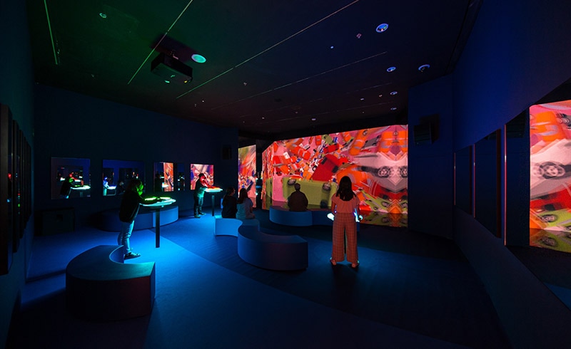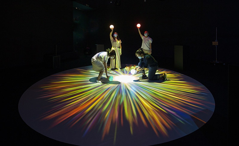 The first realm of the exhibition looks at synesthesia — a neurological phenomenon in which the boundaries between the senses are blurred and sounds can be 'seen' and visuals can be 'heard' or 'felt'. Exhibition co-curator and lead game designer at Enhance, Tetsuya Mizuguchi has explored the potential of synesthesia since his 2001 game, Rez.