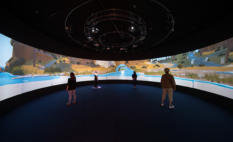 Immerse yourself in a 360-degree scenic projection of the beautiful Mediterranean island from RiME – a videogame developed by Tequila Works. Step into the spotlights on the floor to influence the scene around you and create your own narrative, triggering actions and solving puzzles in order to uncover the next chapter in the story.