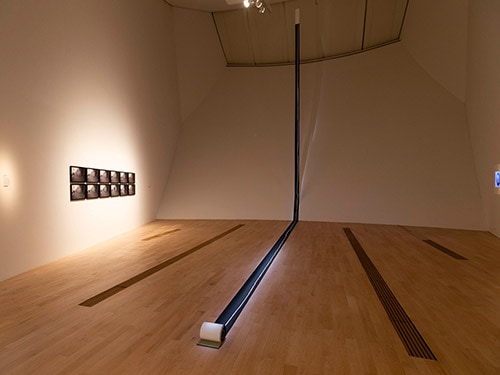 The simplicity of the action and the fact that nothing remains after the performance, gestures to Minimalism and the pared down, natural movement styles seen in the work of dance-artists Anna Halprin and Simon Forti. It also calls to mind the work of Zhang Yu, on view in the first gallery of the exhibition.