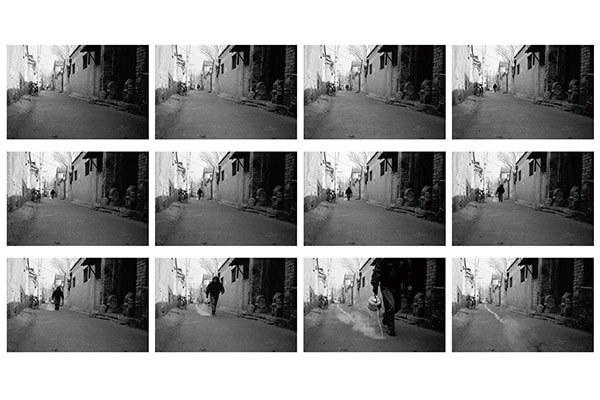 Chinese contemporary artist, Song Dong creates performances, sculptures and installations that reflect on notions of impermanence and transience. The series of black and white images on view are documentation of a live action. They show the artist walking along a Beijing alleyway while pouring boiling water from a large kettle. The poured water marks a line on the ground, while the steam rising from it leaves a trail in the air. The steam dissipates quickly while the water evaporates slowly, eventually leaving no trace of the artist’s action.