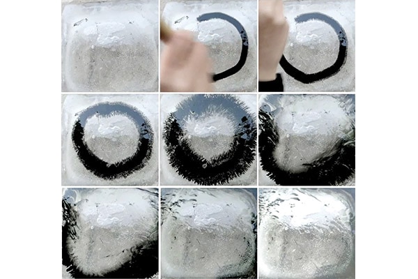 Taipei-based artist, Charwei Tsai, creates highly personal, often politically engaged performative artworks. In the work, Circle, she takes the ensō, or ink circle, as a starting point, echoing the circular structures created by several artists in the exhibition. Tsai paints one smooth brushstroke on the surface of a block of ice. As the surface of the ice melts the ink painting slowly expands and washes away, eventually leaving no trace. The video is looped so the whole process appears to repeat itself endlessly. The ensō — a symbol of the universe and the void, or mu — can be read as a metaphor for the transience of human existence, where things are created and slowly pass, only to begin again.