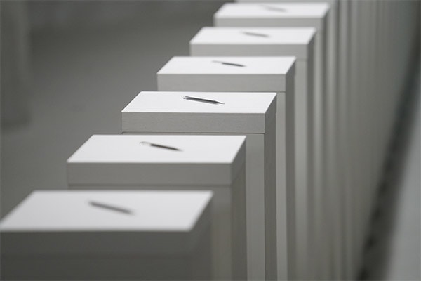 Simple actions echoed by repeated geometries are some of the most recognisable attributes of a Minimalist aesthetic. The photographs and video on view document the bleak simplicity and conviction of Wong’s work. The iron filings are saved and placed in needle-like glass phials presented on a series of identical white plinths to form the installation at the centre of this gallery.