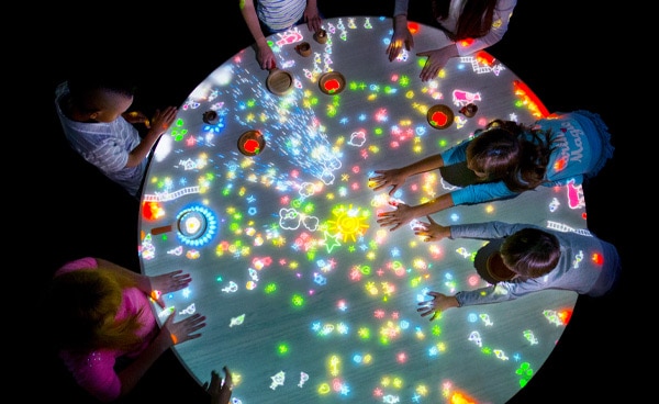 However, when you place your hand or an object on the table, the little people will notice and respond. Their actions change according to the shape and colour of the objects, becoming more animated as more objects are added to their world.