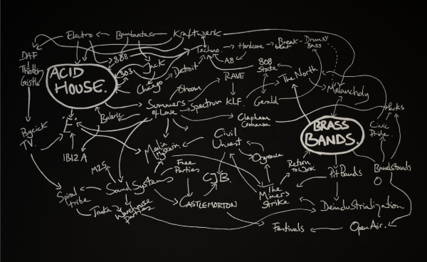 Jeremy Deller’s wall drawing The History of the World (1997 – 2004) maps the historical, political and social confluences between brass band music and acid house. This artwork is another kind of composition and a mind-map of the unique connections Deller sees between different types of music.