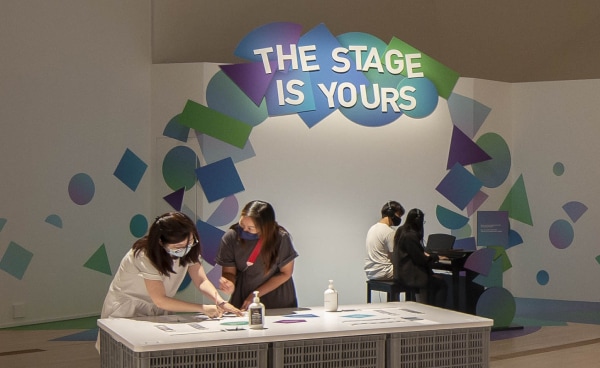 This stage is for you, our visitor. We welcome you to use the piano and/or the theremin. In this exhibition, we have explored how music-making can be as simple as tapping your foot. Performing your own composition or ‘covering’ someone else’s can be done in many ways. We encourage you to take the stage and express yourself! Use your own headphones or ask our Visitor Experience staff for a set of headphones to plug in and play.