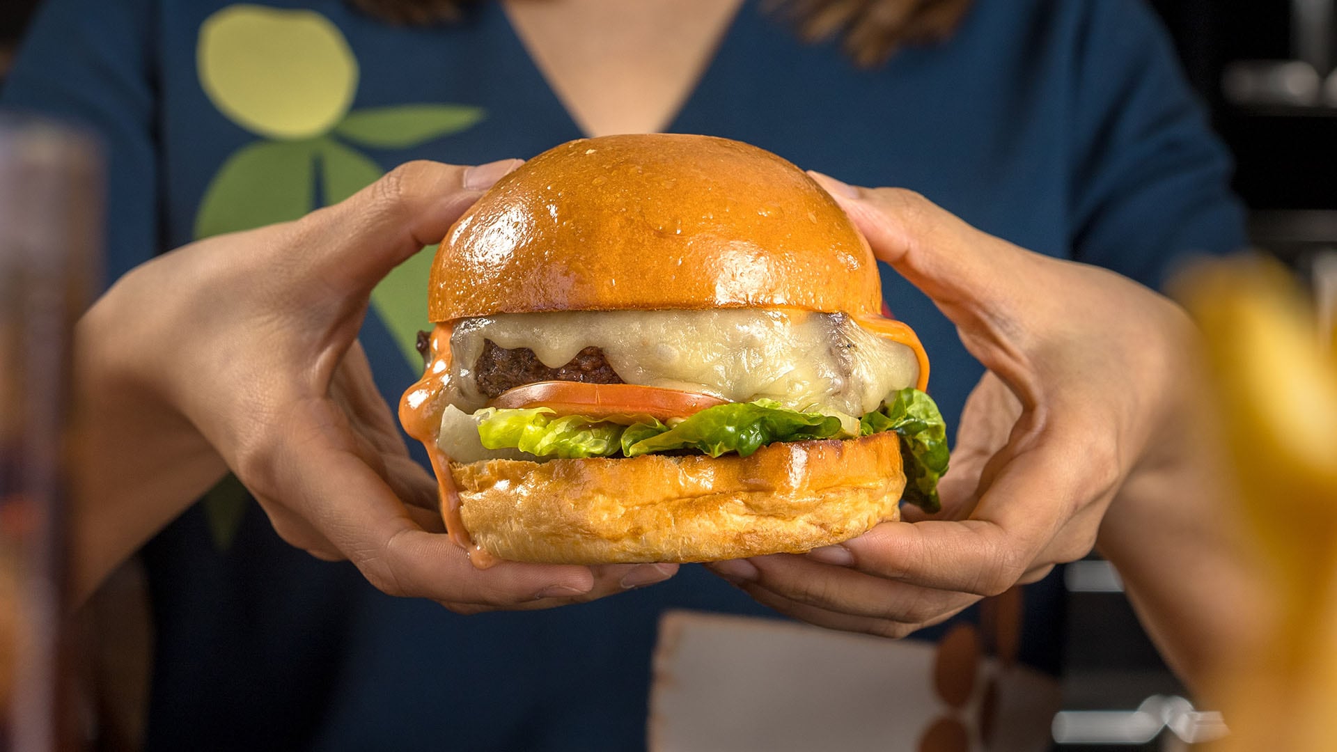DRY-AGED BEEF BURGER WITH MONTEREY JACK CHEESE AND SRIRACHA MAYO