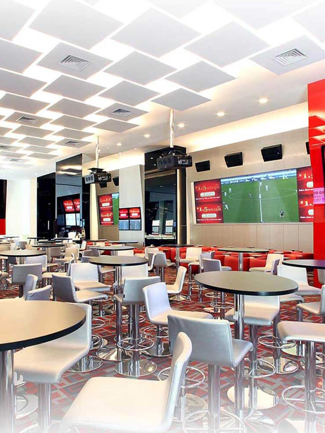 The multiple screens set within the space, including large LCDs and 120-inch projection screens, make it easy to catch several matches in one location.