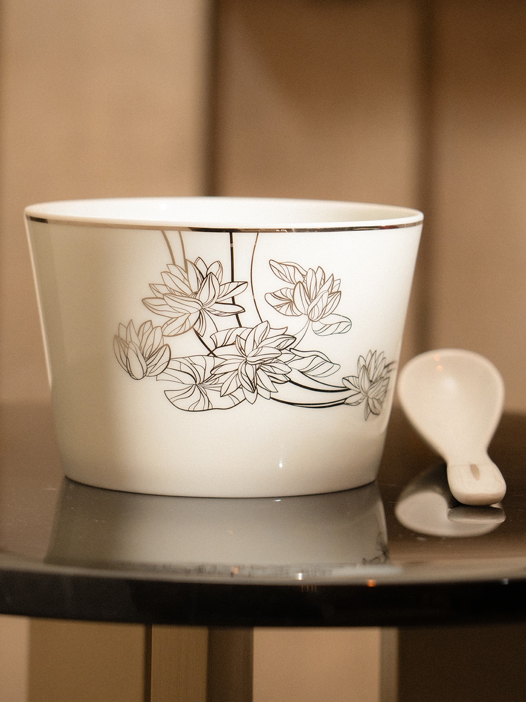 Aside from the tea sets, Legle Asia also manufactured the noodle bowls and spoons for the living areas. The teapot and teacups feature elegant, custom patterns inspired by the armoires in the rooms.